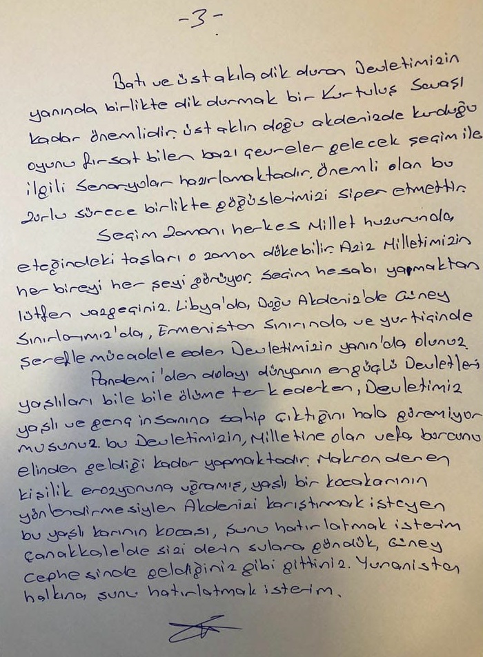 Pandemi’den dolayı dünyanın en güçlü Devletleri yaşlıları bile bile ölüme terk ederken, Devletimiz yaşlı ve genç insana sahip çıktığını hala göremiyormusunuz. Bu Devletimizin, milletine olan vefa borcunu elinden geldiği kadar yapmaktadır. Markon denen kişilik erozyonuna uğramış yaşlı bir koca karının yönlendirmesiyle Akdeniz’i karıştırmak isteyen bu yaşlı karının kocasına şunu hatırlatmak isterim, Çanakkale’de sizi derin sulara gömdük. Güney cephesinde geldiğiniz gibi gittiniz. Yunanistan halkına şunu hatırlatmak isterim Doğu Akdeniz Türk Milleti için bir Çanakkale’dir bir Kafkas cephesidir. Bir kutül ameredir, bir Medine nuhasarasıdır, bir yemendir, bir Doğu cephesidir bir Filistin cephesidir.