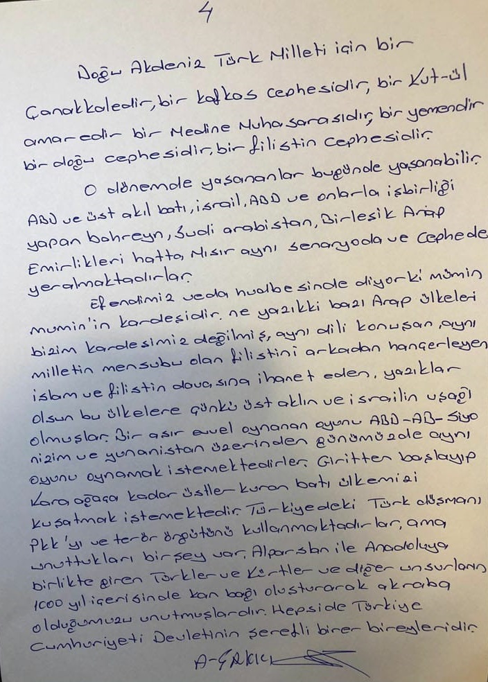 Efendimiz veda hutbesinde diyor ki mümin müminin kardeşidir. Ne yazık ki bazı Arap ülkeleri bizim kardeşimiz değilmiş. Aynı dili konuşan aynı milletin mensubu olan Filistin’i arkadan hançerleyen İslam ve Filistin davasına ihanet eden yazıklar olsun bu ülkelere, çünkü üst aklın ve İsrail'in uşağı olmuşlar. Bir asır evvel oynanan oyunu ABD-AB Siyonizm ve Yunanistan üzerinden günümüzde aynı oyunu oynamak istemektedirler. Girit'ten başlayıp Karaağaca kadar üstler Kur'an Batı ülkemizi kuşatmak istemektedir. Türkiye'deki Türk düşmanı PKK'yı ve terör örgütünü kullanmaktadırlar, ama unuttukları bir şey var Alparslan ile Anadolu'ya birlikte giren Türkler ve Kürtler ve diğer unsurların 1000 yıl içerisinde kan bağı oluşturarak akraba olduğumuzu unutmuşlardır. Hepsi de Türkiye Cumhuriyeti Devleti'nin şerefli birer bireyleridir.
