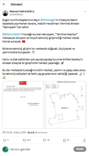 Sanayi ve Teknoloji Bakanı Mehmet Fatih Kacır, konuyla ilgili yaptığı açıklamada, ''Binlerce teknoloji girişimi bu merkezde doğacak, büyüyecek ve yatırımcılarla buluşacak. Kamu ve özel sektörden çok sayıda paydaş kurumla birlikte İstanbul’u küresel düzeyde bir girişimcilik merkezi yapacağız. Bu dev merkezde kuracağımız bilim merkezi, yazılım ve yapay zeka okulu ile teknoloji atölyeleri de farklı yaş gruplarına ev sahipliği yapacak.'' dedi.