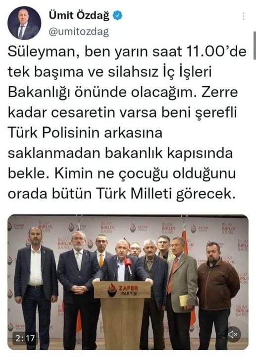 Ben yarın, Zafer Partisi Genel Başkanı olmamın yanı yansıra, Ümit Özdağ olarak tek başıma İçişleri Bakanlığı’nın önüne gideceğim. Tek başıma ve silahsız. Süleyman, zerre kadar erkeklik onurun varsa beni kapının önünde bekle. Seni yarın İçişleri Bakanlığı’nın önünde bulacağım oğlum. O zaman göreceğiz kim operasyon çocuğu, kim Soros’un çocuğu. Saat 11:00’de. Erkeksen orada bekle.”