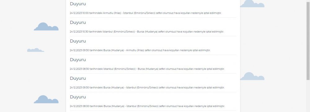 24 Aralık Pazar günü 08.00 ila 10.30 saatlerinde yapılması planlanan Bursa (Mudanya)-İstanbul (Eminönü/Sirkeci), İstanbul (Eminönü/Sirkeci)-Bursa (Mudanya), Bursa (Mudanya)-Armutlu (İhlas) ve Armutlu (İhlas)-İstanbul (Eminönü/Sirkeci) karşılıklı 6 deniz otobüsü seferi iptal ed,ildi.
