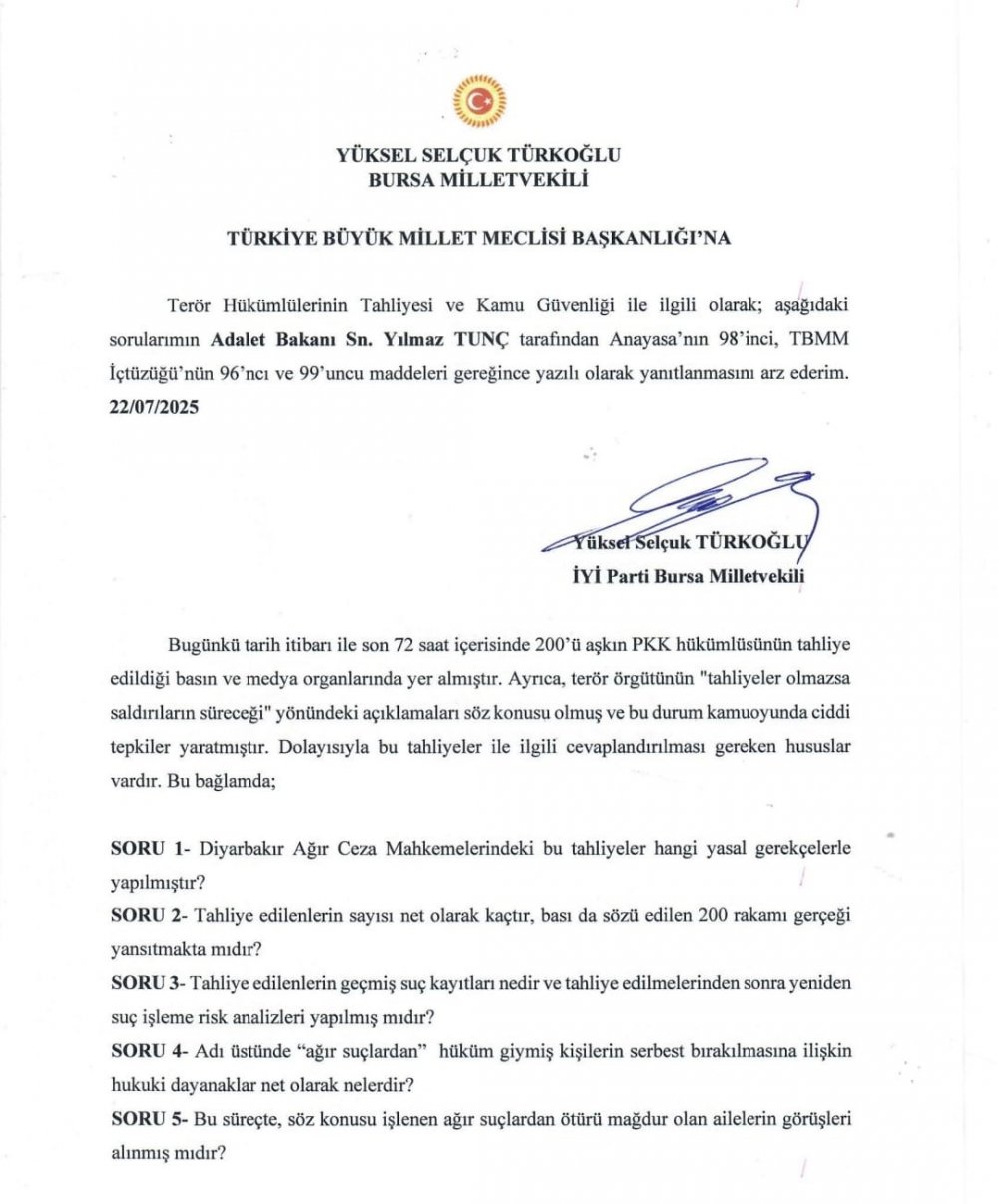 İkinci soru önergesiyle Adalet Bakanlığı’na seslenen Türkoğlu, basına yansıyan haberlere göre son 72 saatte 200’den fazla PKK hükümlüsünün tahliye edildiği bilgisini gündeme getirdi. Tahliyelerin PKK’nın doğrudan tehditleriyle aynı zamana denk gelmesinin kamu vicdanını yaraladığını vurgulayan Türkoğlu, Adalet Bakanı Yılmaz Tunç’a şu soruları yöneltti: