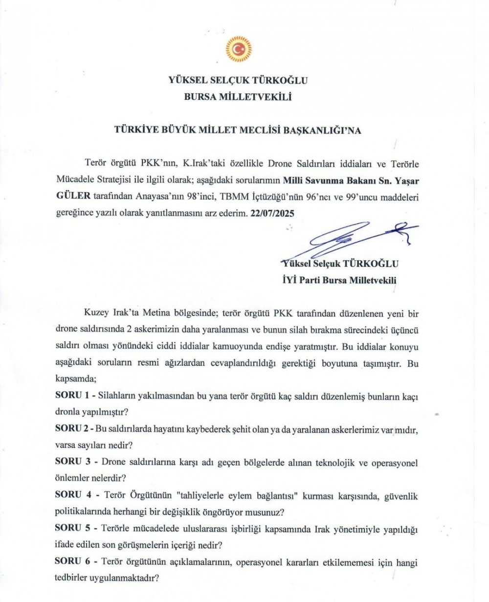 İYİ Parti Bursa Milletvekili Selçuk Türkoğlu, son günlerde art arda gelen dron saldırıları ve PKK’lı hükümlülerin toplu tahliyeleriyle ilgili Meclis’e iki ayrı yazılı soru önergesi verdi.
