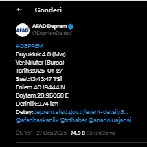 Bugün Bursa Nilüfer ilçesi merkezinde bir deprem meydana geldi.