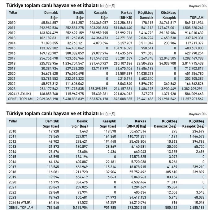 Türkiye’nin 2010 yılından 2024’ün ilk 6 ayına kadar canlı hayvan ithalatını gösteren tablo (Kaynak: TÜİK)