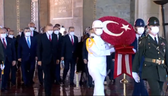 Cumhurbaşkanı Erdoğan’ın, Atatürk'ün mozolesine çelenk bırakmasının ardından saygı duruşunda bulunuldu ve İstiklal Marşı okundu. Cumhurbaşkanı Erdoğan ve törende hazır bulunan devlet erkânı, daha sonra Misak-ı Millî Kulesi'ne geçti. Cumhurbaşkanı Erdoğan, burada Anıtkabir Özel Defteri'ni imzaladı.