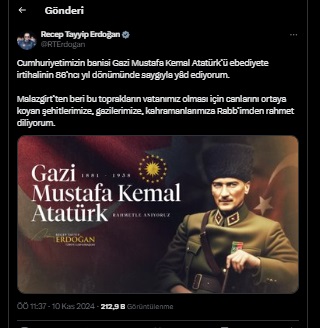 "Cumhuriyetimizin banisi Gazi Mustafa Kemal Atatürk’ü ebediyete irtihalinin 86’ncı yıl dönümünde saygıyla yâd ediyorum.