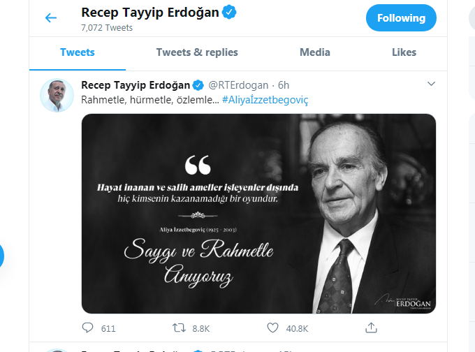 Cumhurbaşkanı Erdoğan, Bosna Hersek'in eski Cumhurbaşkanı Aliya İzzetbegoviç'in ölüm yıldönümü vesilesiyle twitter hesabından bir paylaşımda bulundu.