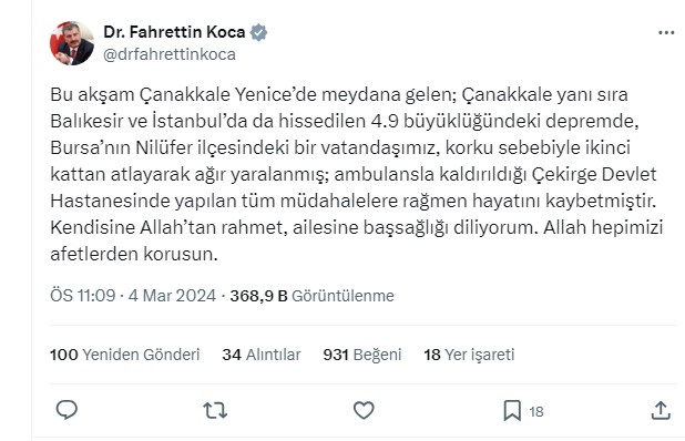 Sağlık Bakanı Fahrettin Koca, (X) sosyal medya hesabından; "Bu akşam Çanakkale Yenice’de meydana gelen; Çanakkale yanı sıra Balıkesir ve İstanbul’da da hissedilen 4.9 büyüklüğündeki depremde, Bursa’nın Nilüfer ilçesindeki bir vatandaşımız, korku sebebiyle ikinci kattan atlayarak ağır yaralanmış; ambulansla kaldırıldığı Çekirge Devlet Hastanesinde yapılan tüm müdahalelere rağmen hayatını kaybetmiştir. Kendisine Allah’tan rahmet, ailesine başsağlığı diliyorum. Allah hepimizi afetlerden korusun" şeklinde açıklamada bulundu.