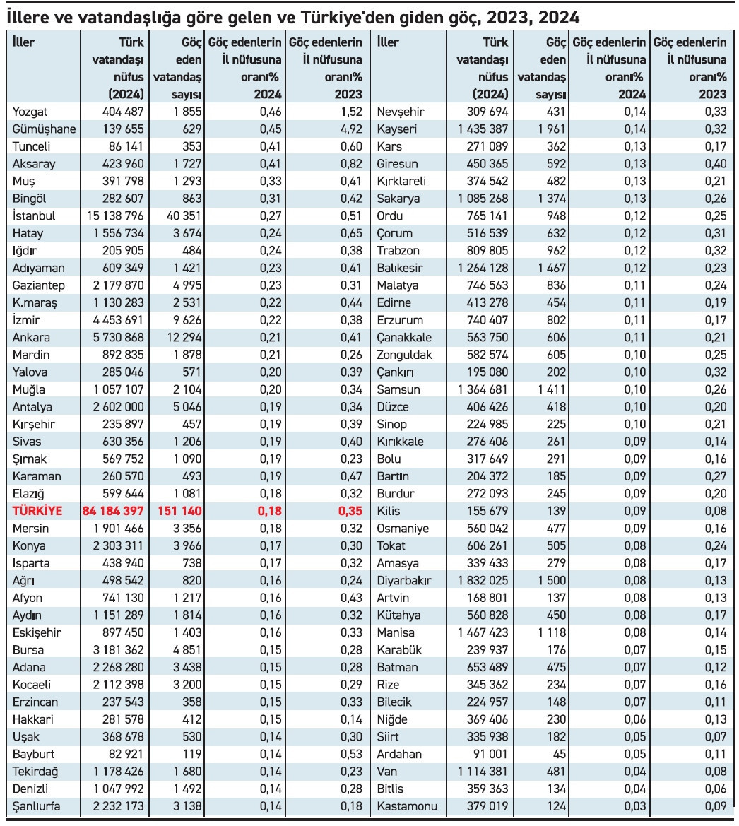 Gümüşhane’de, 2023’te göç edenlerin il nüfusuna oranı %4,92 gibi tarihi bir orana ulaşmış. Her 100 kişiden 5’i göç etmiş! Yozgat’ta ise her 100 kişiden 1,5’i göç etmiş. 2024’te sayılar, oranlar düşmekle birlikte de bu iki il yine zirvede.