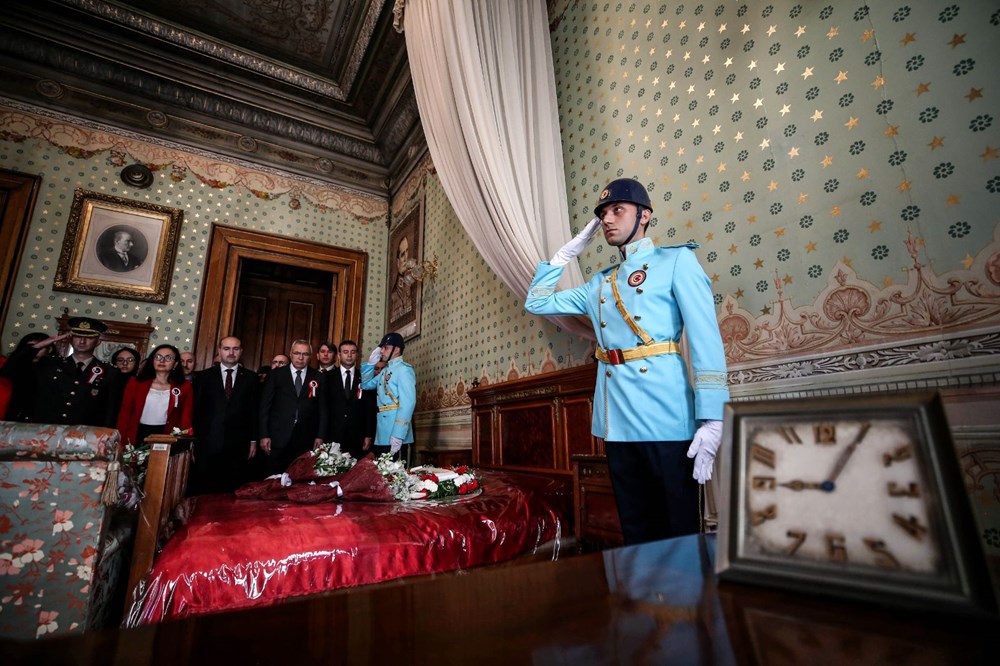 Sarayın Harem bölümündeki 71 numaralı odada düzenlenen anma töreni, Cumhurbaşkanlığı Milli Saraylar İdaresi Başkanı Yasin Yıldız, İstanbul Vali Yardımcısı Hülya Kaya, 1. Ordu Komutanlığı'ndan Albay Serkan Çetin, İstanbul Büyükşehir Belediyesi Başkanvekili Hüseyin Aksu, Beşiktaş Belediye Başkanı Rıza Akpolat ile Atatürk Kültür Dayanışma Eğitim Vakfı (AKDEV) Genel Başkanı Gül Karayaldız'ın kurumları adına çelenk ve buketlerini, Atatürk'ün ebediyete intikal ettiği yatağın üzerine bırakmalarıyla başladı.