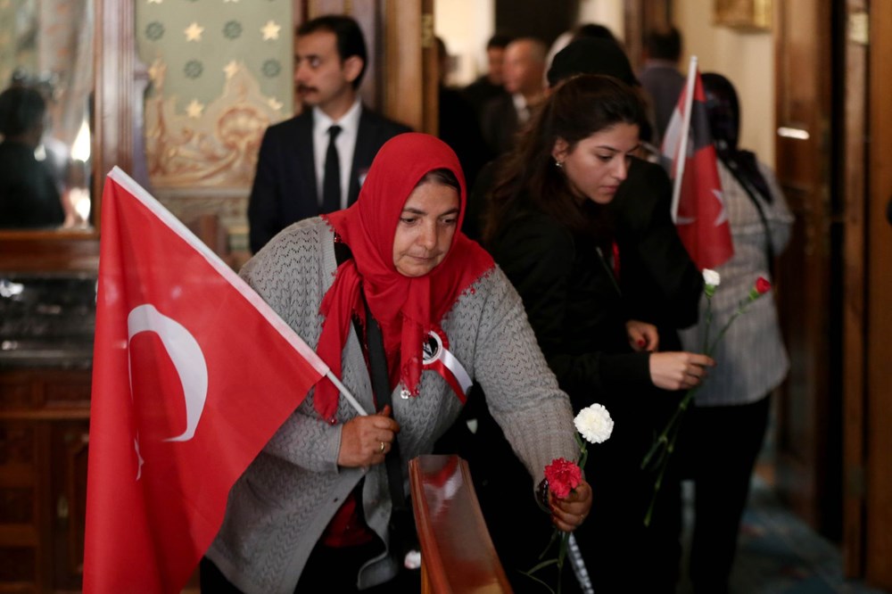 Saray önünde erken saatlerden itibaren uzun kuyruklar oluşturan vatandaşlar ve öğrenciler, Atatürk'ün yatağına ve çevresine beyaz ve kırmızı karanfiller bıraktı.