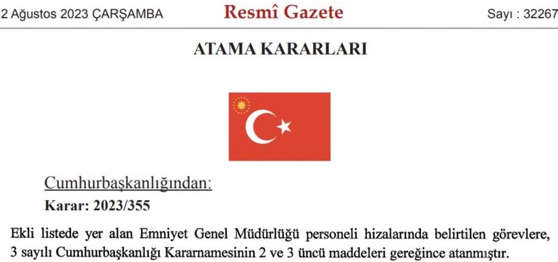 Cumhurbaşkanı Erdoğan'ın imzasıyla Resmi Gazetede yayımlanarak yürürlüğe giren Cumhurbaşkanlığı kararı kapsamında, Emniyet Genel Müdürlüğü'nde 83 atama yapıldı. 52 ilin emniyet il emniyet müdürleri değişirken, 24 ilin emniyet müdürü de Genel Merkez emrine alındı.