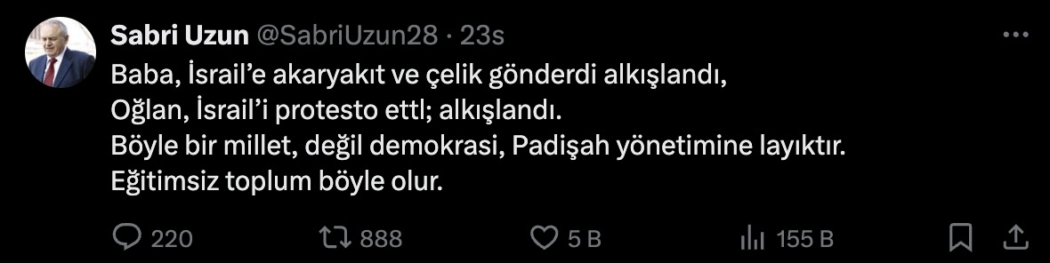 Sabri Uzun, dün sosyal medya hesabından İsrail'e dair yaptığı paylaşımda, "Baba, İsrail’e akaryakıt ve çelik gönderdi, alkışlandı. Oğlan, İsrail’i protesto etti; alkışlandı. Böyle bir millet, değil demokrasi, Padişah yönetimine layıktır. Eğitimsiz toplum böyle olur" ifadelerini kullanmıştı.