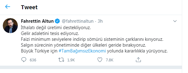 "İthalatı değil üretimi destekliyoruz. Gelir adaletini tesis ediyoruz. Faizi minimum seviyelere indirip sömürü sisteminin çarklarını kırıyoruz. Salgın sürecinin yönetiminde diğer ülkeleri geride bırakıyoruz. Büyük Türkiye için #TamBağımsızEkonomi yolunda kararlılıkla yürüyoruz."