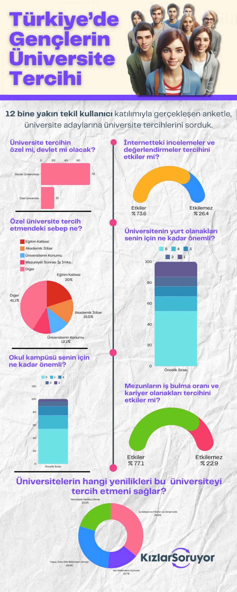"Kızlar Soruyor" tarafından yapılan anket sonuçlarına göre, katılımcıların %78.2’si devlet üniversitesi seçeceğini belirtirken, %21.3’ü özel üniversite tercih edeceğini ifade etti.