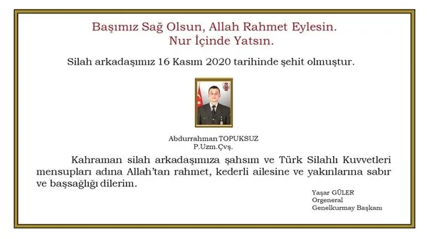 Milli Savunma Bakanlığı, "Hakkâri /Çukurca Irak sınır hattında icra edilen operasyon esnasında 16 Kasım 2020 tarihinde bir kahraman silah arkadaşımız, bölücü terör örgütü mensuplarınca gerçekleştirilen taciz atışı neticesinde şehit olmuştur. Bizleri derin bir acı ve üzüntüye boğan bu olayda hayatını kaybeden aziz şehidimize Allah'tan rahmet, kederli ailesine, Türk Silahlı Kuvvetleri ile asil milletimize başsağlığı ve sabır dileriz." şeklinde açıklamada bulundu.