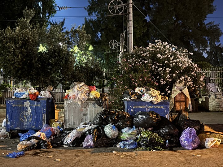 İzmir'in Buca ilçesinde belediye işçilerinin grevi nedeniyle biriken çöp yığınları ve kötü koku tepkiye neden oldu.