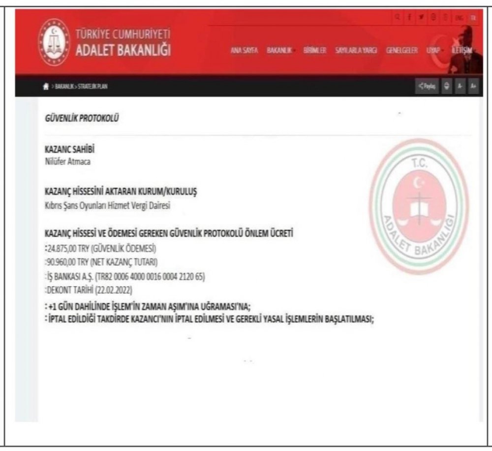 Öte yandan çalışmayı derinleştiren ekipler, şüphelilerin kazandıkları paraları alabilmeleri için vergi, dosya masrafı adı altında para aldıkları ve işlemlerin legal olduğuna inandırmak adına müşteki şahıslara sahte olarak düzenlenmiş üzerinde Adalet Bakanlığının resmi kurum logosu ve sitesine ait ekran resminin bulunduğu çeşitli belge ve resim göndererek, İzmir'de 15 vatandaşı 401 bin 964 lira, ülke genelinde ise 121 kişiyi yaklaşık 2 milyon lira dolandırdıklarını ortaya çıkardı.