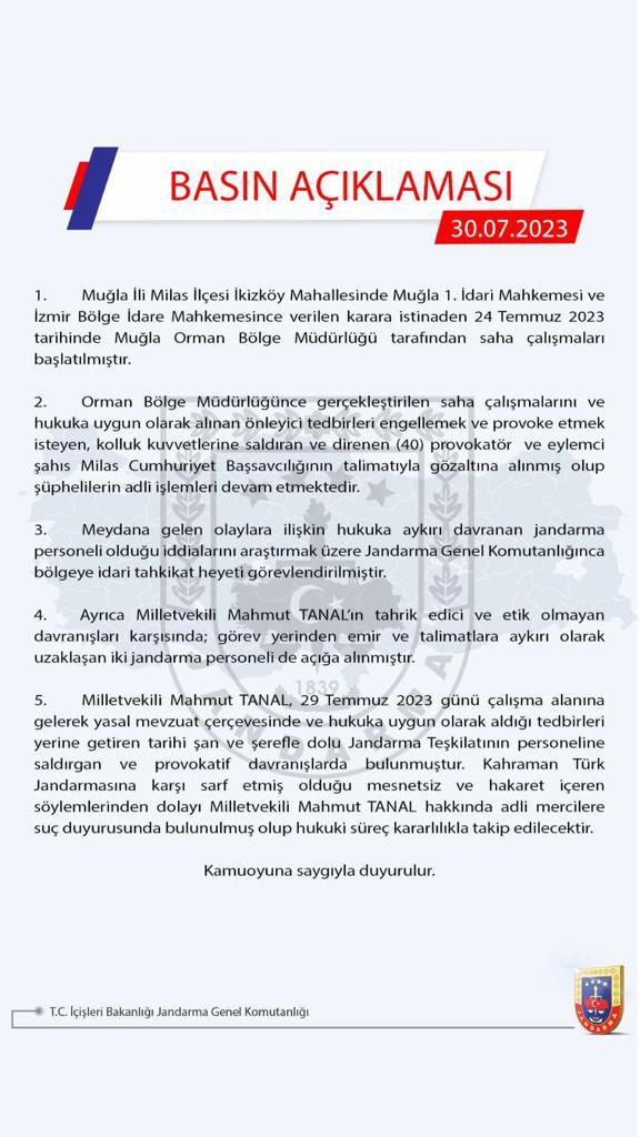 Açıklamada “kolluk kuvvetlerine saldıran ve direnen 40 provokatör ve eylemci şahıs Milas Cumhuriyet Başsavcılığı'nın talimatıyla gözaltına alınmış olup, şüphelilerin adli işlemleri devam etmektedir” denildi.