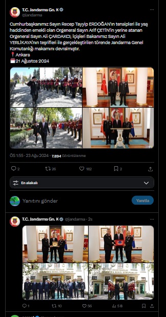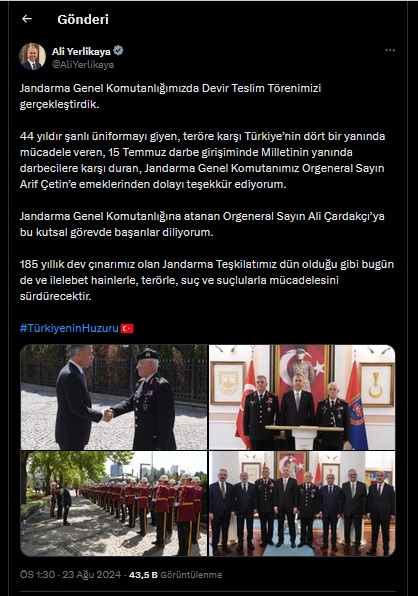 Yine sosya medya hesabından paylaşımda bulunan İçişleri Bakan Ali Yerlikaya da, emekli olan Orgeneral Arif Çetin Paşa'dan övgüyle bahsederek, "44 yıldır şanlı üniformayı giyen, teröre karşı Türkiye’nin dört bir yanında mücadele veren, 15 Temmuz darbe girişiminde Milletinin yanında darbecilere karşı duran, Jandarma Genel Komutanımız Orgeneral Sayın Arif Çetin’e emeklerinden dolayı teşekkür ediyorum.." dedi.