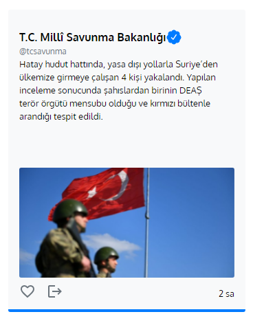 Bakanlığın web sayfasından yapılan bu açıklamada "Hatay hudut hattında, yasa dışı yollarla Suriye'den ülkemize girmeye çalışan 4 kişi yakalandı. Yapılan inceleme sonucunda şahıslardan birinin DEAŞ terör örgütü mensubu olduğu ve kırmızı bültenle arandığı tespit edildi." deniliyor.