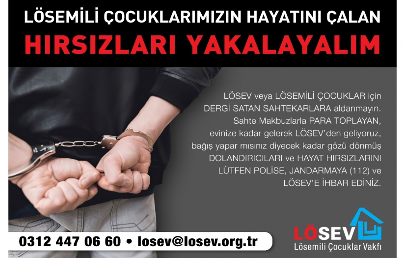 Lösemili ve kanserle mücadele eden çocukların sağlık ve eğitim başta olmak üzere her türlü ihtiyacını karşılamak amacıyla kurulan Ankara merkezli LÖSEV Lösemili Çocuklar Vakfı’ndan sahtekârlık uyarısı geldi. 81 ilde organize olarak kapı kapı dolaştığı tespit edilen kişilerin, “LÖSEV’den geliyoruz, gazete ve dergimizi almak istemez misiniz” sorusunun ardından, kişilerden çeşitli miktarlarda para talep etmesi LÖSEV’i harekete geçirdi.
