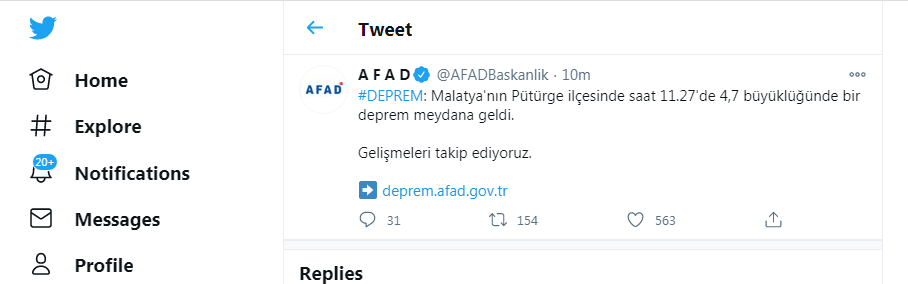 Deprem AFAD'ın sosyal medya sayfasında da son dakika haberi olarak yayınlandı.