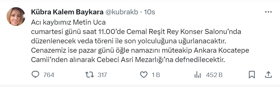 Sosyal medya sayfasında bir mesaj yayınlayan Kübra Kalem Baykara, "Acı kaybımız Metin Uca cumartesi günü saat 11.00’de Cemal Reşit Rey Konser Salonu’nda düzenlenecek veda töreni ile son yolculuğuna uğurlanacaktır. Cenazemiz ise pazar günü öğle namazına müteakip Ankara Kocatepe Camii’nden alınarak Cebeci Asri Mezarlığı’na defnedilecektir” dedi.