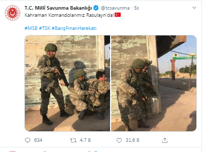 Milli Savunma Bakanlığı (MSB), sosyal medya hesabı Twitter üzerinden, “Kahraman Komandolarımız Rasulayn’da!” notu düşerek, harekata katılan ve Rasulayn’da görev yapan komandoların fotoğraflarını paylaştı.
