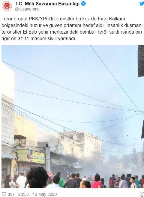"Terör örgütü PKK/YPG'li teröristler bu kez de Fırat Kalkanı bölgesindeki huzur ve güven ortamını hedef aldı. İnsanlık düşmanı teröristler El Bab şehir merkezindeki bombalı terör saldırısında biri ağır en az 11 masum sivili yaraladı." denildi.