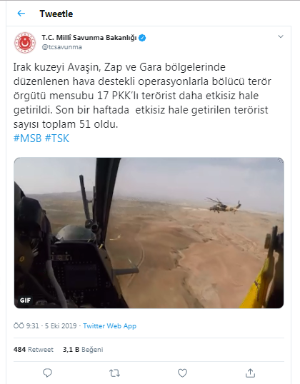 Milli Savunma Bakanlığı'nın sosyal medya (Twitter) hesabından, "Irak kuzeyi Avaşin, Zap ve Gara bölgelerinde düzenlenen hava destekli operasyonlarla bölücü terör örgütü mensubu 17 PKK’lı terörist daha etkisiz hale getirildi. Son bir haftada etkisiz hale getirilen terörist sayısı toplam 51 oldu" şeklinde açıklamada bulunuldu.
