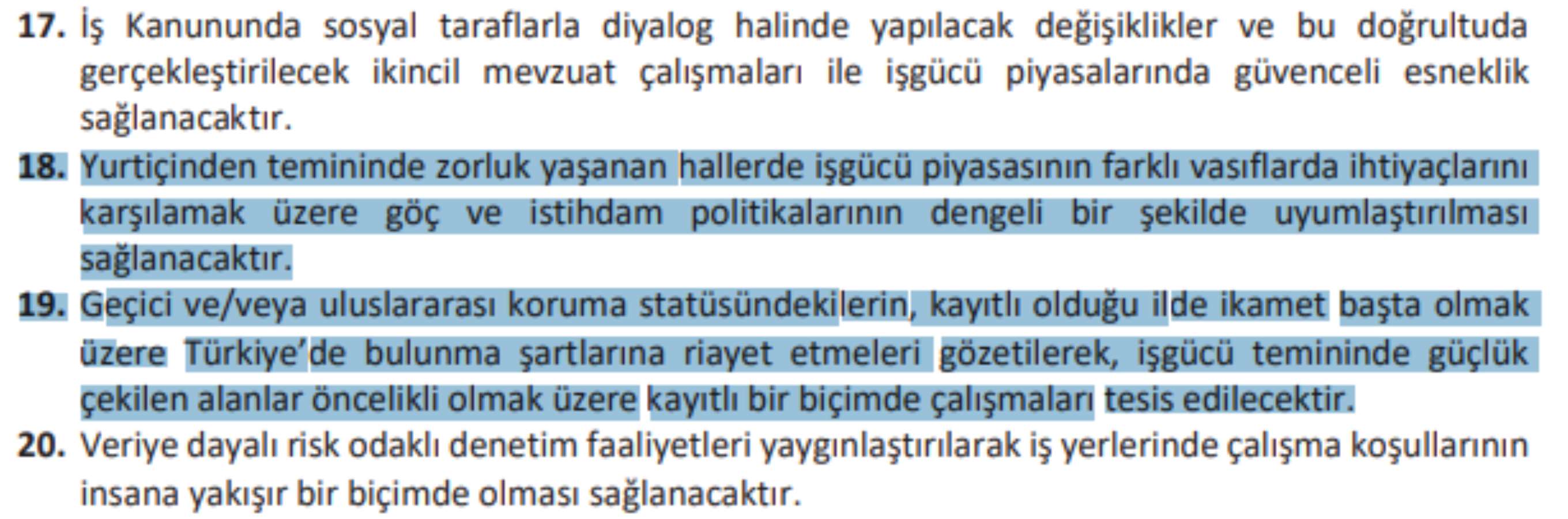 Programda yer alan, “Yurtiçinde temininde zorluk yaşanırsa farklı vasıflarda ihtiyaçları karşılamak üzere göç ve istihdam politikaları uyumlaştırılacak” ifadeleri dikkat çekti.
