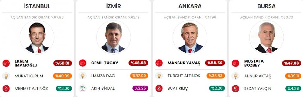 Türkiye genelinde oy sandıklarının yarısı saat 21.00 sularında açıldı ve buna göre İstanbul, İzmir, Ankara ve Bursa Büyükşehirlerinde CHP adaylarının yarışı önde götürdükleri anlaşıldı.