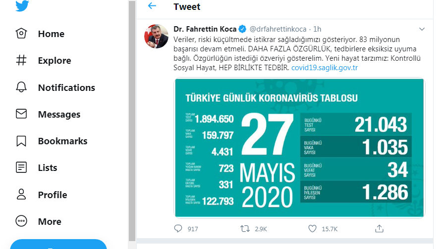 Sağlık Bakanı Dr. Fahrettin Koca, 27 Mayıs 2020 günü itibariyle Korona salgını konusuyla ilgili verileri sosyal medya hesabından açıkladı.