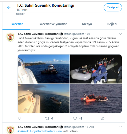 Sahil Güvenlik Komutanlığı'nın sosyal medya sayfasından verilen bilgilere göre, 29 Kasım ve 5 Aralık tarihlerinde 7 gün 24 saat esasına göre yürütülen faaliyetler kapsamında 23 olayda 698 kaçak göçmen yakalandı.