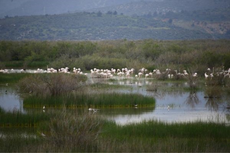 İzmir'in Selçuk ilçesinin Pamucak sahiline yakın çorak bölgesi, bu yıl flamingoların ve diğer kuş türlerinin göçü sırasında oluşan görüntülere ev sahipliği yapıyor.