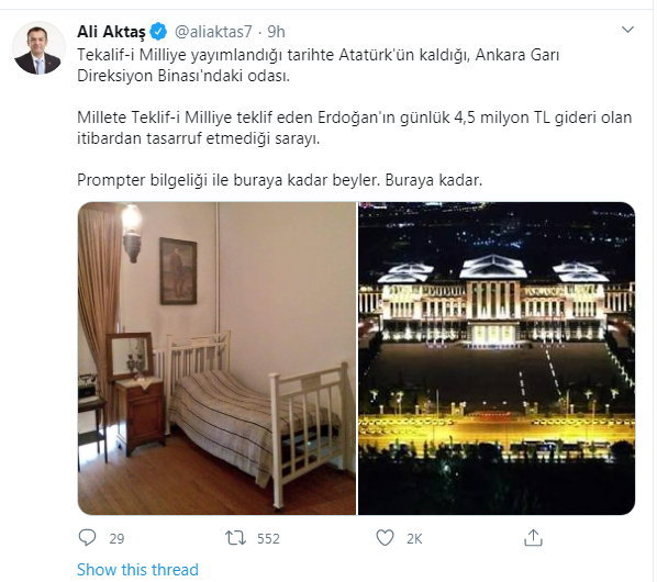 Aktaş, sosyal medya sayfasından fotoğraflarla yaptığı paylaşımında; Tekalif-i Milliye yayımlandığı tarihte Atatürk'ün kaldığı, Ankara Garı Direksiyon Binası'ndaki odası ile Cumhurbaşkanlığı Sarayı'nın fotoğraflarını kullanarak, "Tekalif-i Milliye yayımlandığı tarihte Atatürk'ün kaldığı, Ankara Garı Direksiyon Binası'ndaki odası. Millete Teklif-i Milliye teklif eden Erdoğan'ın günlük 4,5 milyon TL gideri olan itibardan tasarruf etmediği sarayı. Prompter bilgeliği ile buraya kadar beyler. Buraya kadar." diye seslendi.