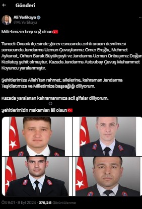 Bakan Yerlikaya bu açıklamasında; "Milletimizin başı sağ olsun. Tunceli'nin Ovacık ilçesinde görev esnasında zırhlı aracın devrilmesi sonucunda Jandarma Uzman Çavuşları Ömer Eroğlu, Mehmet Aykanat, Orhan Burak Büyükçaylı ve Jandarma Uzman Onbaşı Doğan Kızılateş şehit olmuştur. Kazada Jandarma Astsubay Çavuş Muhammet Koyuncu yaralanmıştır" dedi.