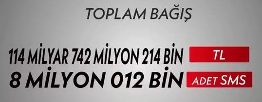 Bu arada depremzedelere maddi yardımda bulunmak üzere bir araya gelerek ortak yayın yapan TRT 1, TV8, Kanal D, ATV, Star TV, Show TV, Kanal 7 ve Fox TV, canlı yayın iş adamlarının ve kurumların bağışlarını kabul ve ilan ettiler.