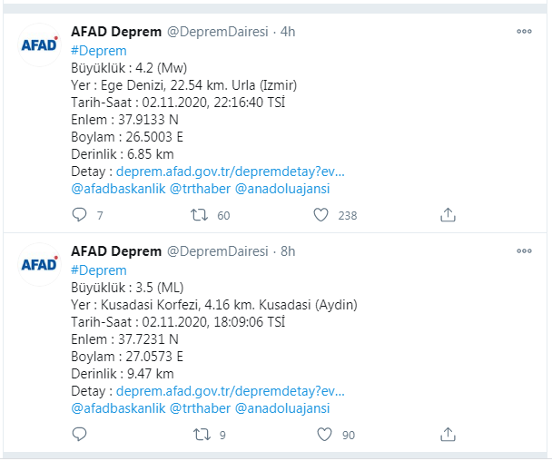 AFAD Deprem Dairesi tarafından yapılan açıklamaya göre, İzmir’in Urla ilçesi 22,54 Km açıklarında, 2 Kasım 2020 tarihi saat 22.16’da Richter ölçeğine göre 4.2 büyüklüğünde bir deprem daha meydana geldi.