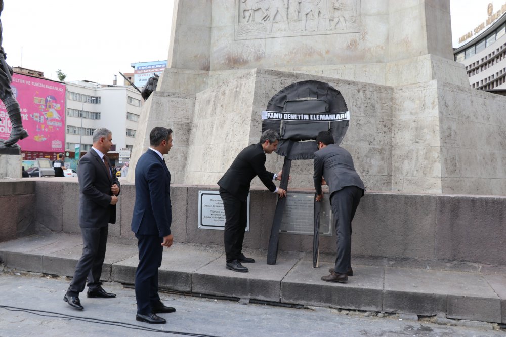 Kamu kurumlarının İnceleme, Teftiş ve Denetim Kurullarında görevli yaklaşık 20 bin denetim elemanını temsil eden dernek başkanları ve meslek mensupları, Ankara Ulus’taki Atatürk Anıtı önünde bir araya geldi. Yaklaşık 500 kişinin katıldığı basın açıklamasında özlük haklarında iyileştirme talebi dile getirildi. İstiklal Marşı ve saygı duruşuyla başlayan programda kamu denetim elemanları adına anıta siyah çelenk bırakıldı.