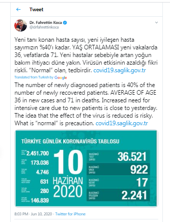 "" Yeni tanı konan hasta sayısı, yeni iyileşen hasta sayımızın %40’ı kadar. YAŞ ORTALAMASI yeni vakalarda 36, vefatlarda 71. Yeni hastalar sebebiyle artan yoğun bakım ihtiyacı düne yakın. Virüsün etkisinin azaldığı fikri riskli. “Normal” olan, tedbirdir..""