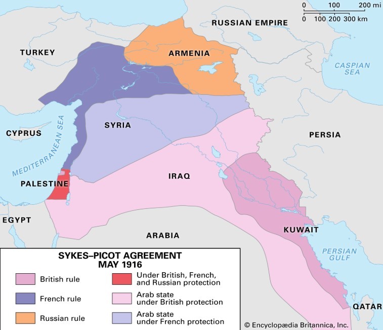 Rusya’nın onayını aldıktan sonra İngiltere ve Fransa arasında Sykes-Picot Antlaşması imzalandı (16 Mayıs 1916)[3].