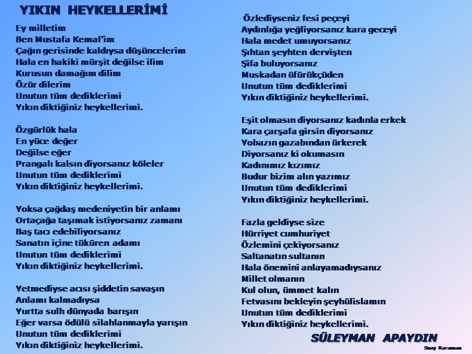 Atatürk’e karşı nefret ve düşmanlık, özellikle son 20 yılda büyük boyutlara ulaşmıştır ancak bu olayın boyutu çok eskilere dayanmaktadır. Ulusal Kurtuluş Savaşı sırasında, cumhuriyet kurulurken, devrim yasaları çıkarılırken, Atatürk ve aydınlanma karşıtları hep vardı. Hatta Atatürk’ü ortadan kaldırmak için planlar yapıldığı da unutulmamalıdır. Atatürk’ün ölümünden sonra hızla başlayan aydınlanma karşıtı hareketler sonucunda, bugünkü karanlık günlere gelinmiş ve Atatürk’ten öç alma duygusu gelişmiştir. Ama ne yapılırsa yapılsın, bu topraklarda Mustafa Kemal’in özgürlük şarkıları yankılanır, Mustafa Kemaller ölmez, Mustafa Kemal’in askerleri tükenmez ve yenilmez.
